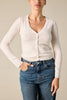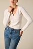 100% pure cashmere v cardigan in winter white. The Rhian cardigan is fitted & cropped to wear on its own or layered. It has our signature tiny shell buttons to close and is a lightweight style that makes it perfect to take anywhere for when you need that light cashmere layer.