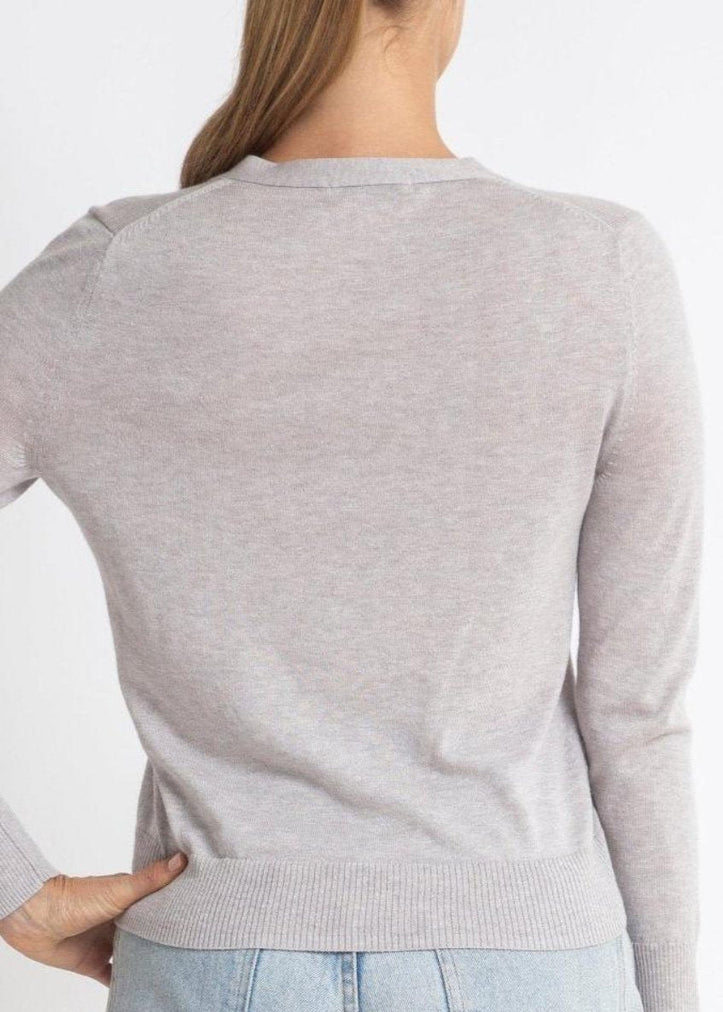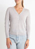 95% cotton 5% cashmere v-neck cardigan in silver marle. Our superfine V cardigan is a more relaxed, casual style with long sleeves and a fine rib on the wrist and hem. It has our signature shell buttons, only larger and can be worn fitted and form hugging or looser and relaxed depending on the size you choose. Perfect worn open as a light layer in the warmer weather the cotton + cashmere fabrication is so soft against your skin.