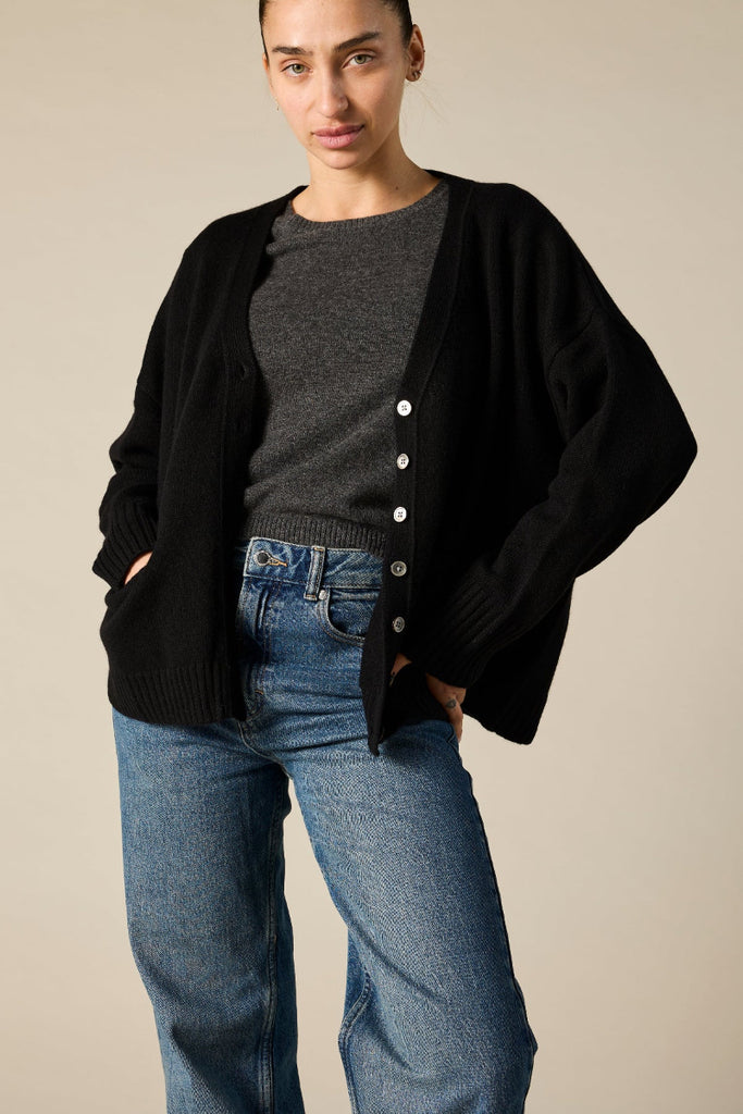 100% cashmere Ruby is a boxy & oversized cardigan in black. This square cut cardigan is a chunky 5ply knit with rib trims & v neckline and pockets. A relaxed style that sits loose on your body with a dropped shoulder & roomy sleeves. Cosy and warm it is perfect worn open and layered or simply on its own. Add one of our cashmere scarves for extra warmth.