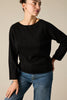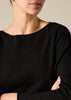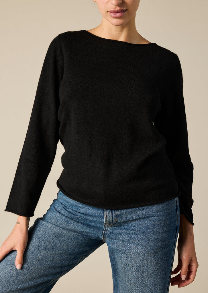 This pure cashmere bateau neck in black is a lightweight knit with a wide neck that elegantly follows your collarbone. Finished with clean rolled knit edges it is a neat boxy shape that skims the body in a slightly loose and relaxed way. With bracelet length sleeves this classic style can be worn casually everyday or easily dressed up with the focus on your neckline.