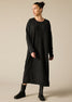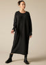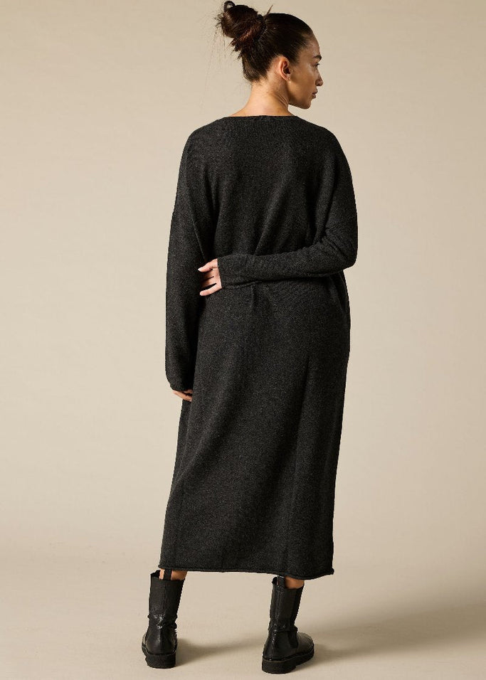 Pure cashmere knitted jumper dress in charcoal marle grey. This is a long & oversized knit dress in a fine gauge with an optional thin tie. It is an extra wide, straight & extra long jumper with a rolled hem to be worn big & cosy. Add the knit tie or your own belt on waist or hips, the volume in the dress is what makes it a new fluid way to wear a cashmere dress this winter. A scoop neck & thin sleeves add to the look of sporty elegance.