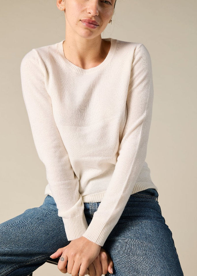 100% cashmere crew neck in the winter white. This classic crew neck is the perfect fit. Not too big and not too small, it is great worn on its own with jeans for a soft casual day look or team with pearls and super high heels for evening. This versatile cashmere piece easily fits under a jacket for layering or over a shirt for warmth. Its beauty lies in the simplicity and feel against your skin.