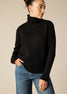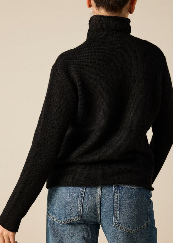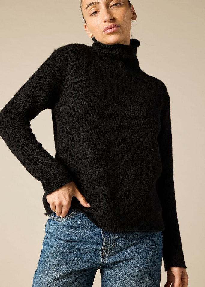100% cashmere boxy relaxed funnel neck knit in black. This square style is knitted in a chunky large ply and yet is as light & soft as a feather. It has a relaxed high neck that sits away to keep you warm but not constrict and falls away from the body with a slightly dropped shoulder. Clean rolled edges give it a soft modern edge.